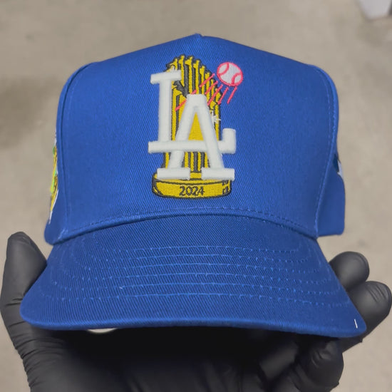 LA IN 3D EMBROIDERY WITH WORLD SERIES TROPHIES BEHIND